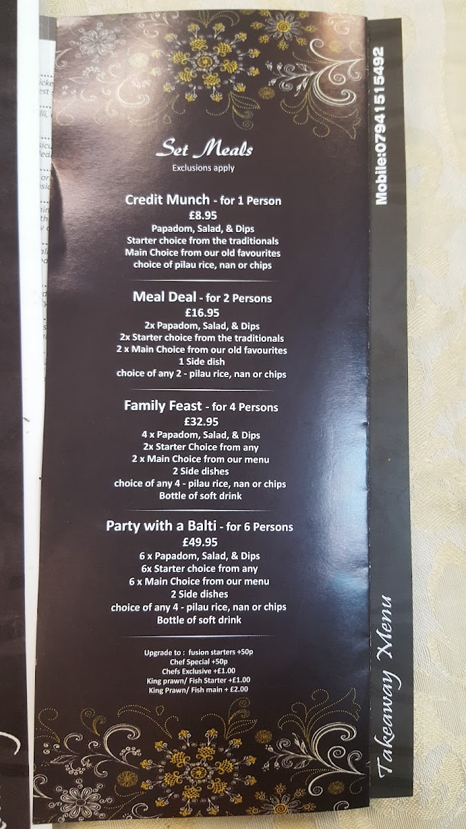 2 papadoms with dips and salad, any starter, any 2 main dishes from menu, 1 bombay aloo side dish, 1 pilau rice, 1 naan or chips & 2 can of Pepsi